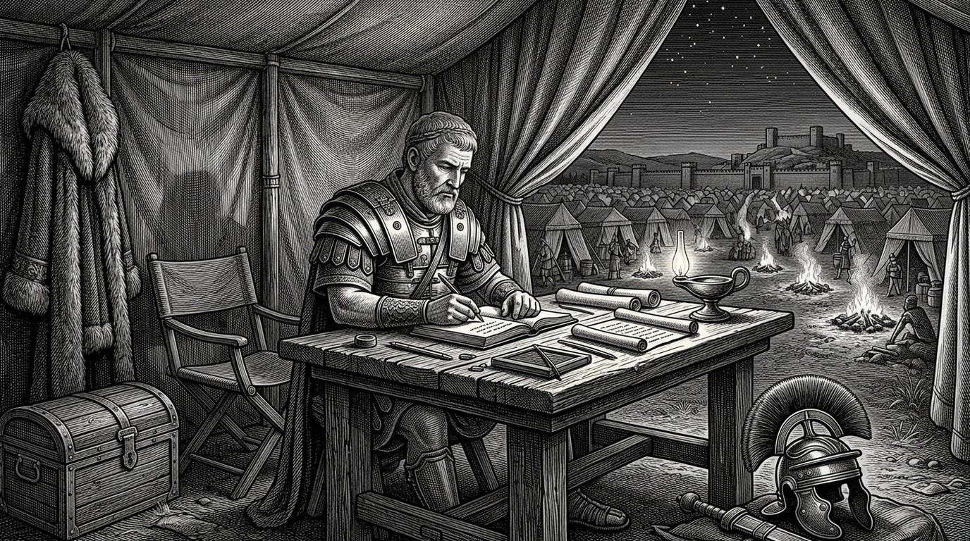 A military tent on the northern bank of the Danube, sometime around 170 AD. Marcus Aurelius picks up his pen. He writes himself a correction: a recalibration of something he’d already told himself before, in different words, under different circumstances, with a different quality of fatigue pulling at his attention.