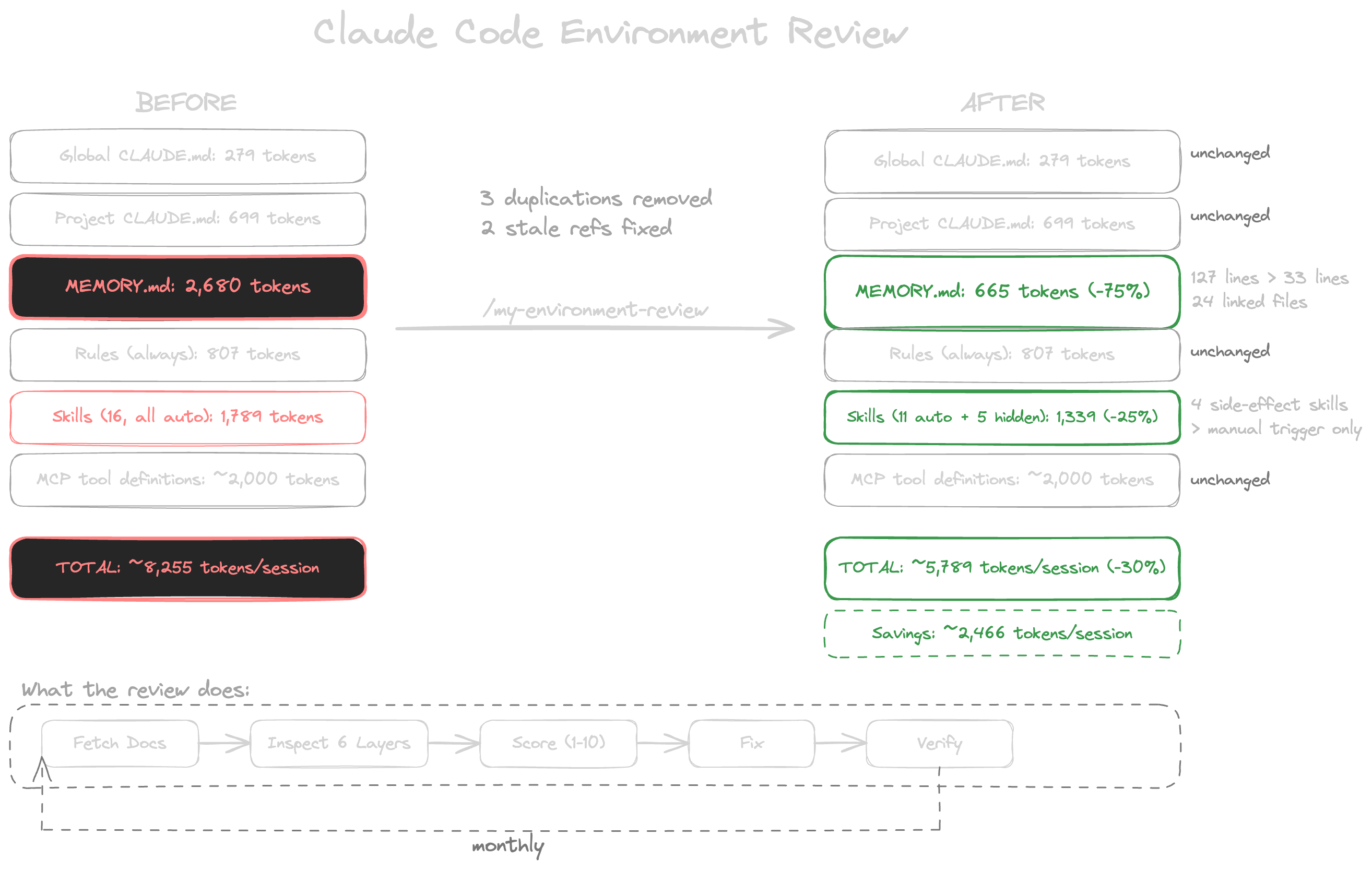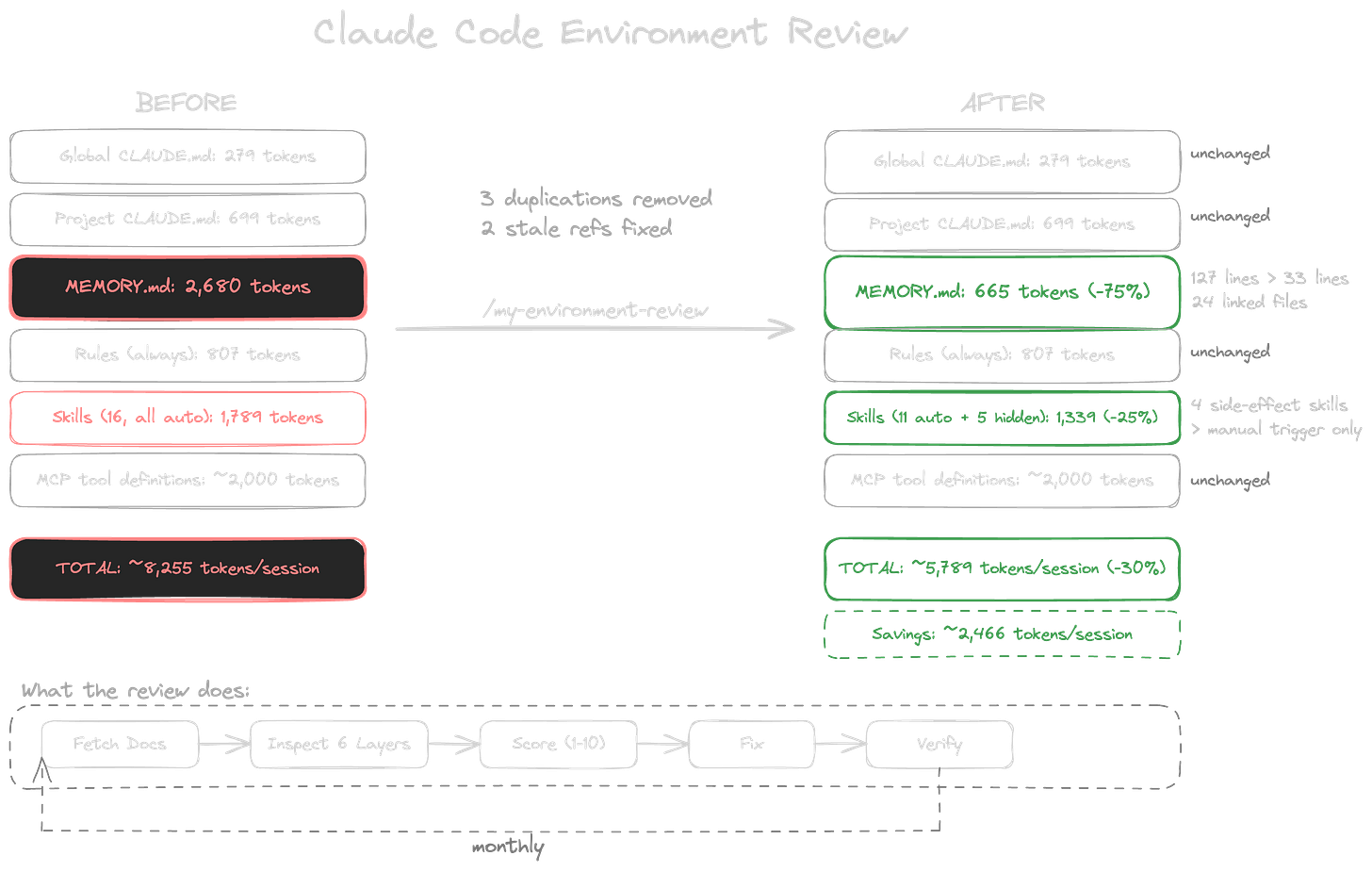 The tool that found all of this is a single skill. It fetches Anthropic’s current documentation on every run, walks every configuration layer, cross-references every file, counts the tokens, scores the environment against a rubric, and implements the prioritised fixes. One command. Full cycle: inspect, score, report, fix, verify. The same principle applies to any AI workflow: the agent that builds something shouldn’t be the only one reviewing it.